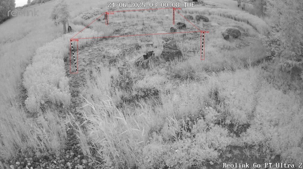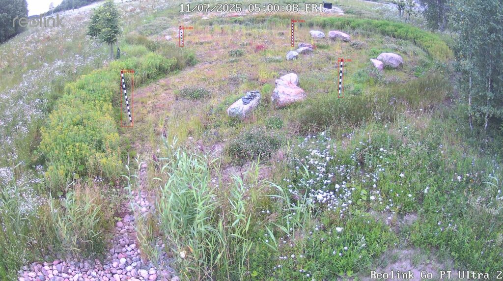 The first pilot project focused on ditch environments in Southwest Finland located near agricultural fields. These ditches collect and convey water onward through the catchment area and ultimately toward the sea, making them relevant from the perspective of nutrient transport and environmental loading. During the project, several planning meetings were held with the partner organisation and a practical protocol for image acquisition and analysis was established. Images were collected during the summer months using a fixed camera setup, with repeated imaging under consistent settings in order to ensure comparability and support reliable quantitative analysis. Reference poles were included in the imaging setup to enable later measurement of changes in water level and vegetation growth. Based on the collected material, Turku BioImaging’s analysis team developed an image-analysis pipeline and trained an image classifier to identify the images that were relevant for further analysis. This formed the technical basis for the next stage, namely quantifying water level and vegetation growth over time using the reference points in the images